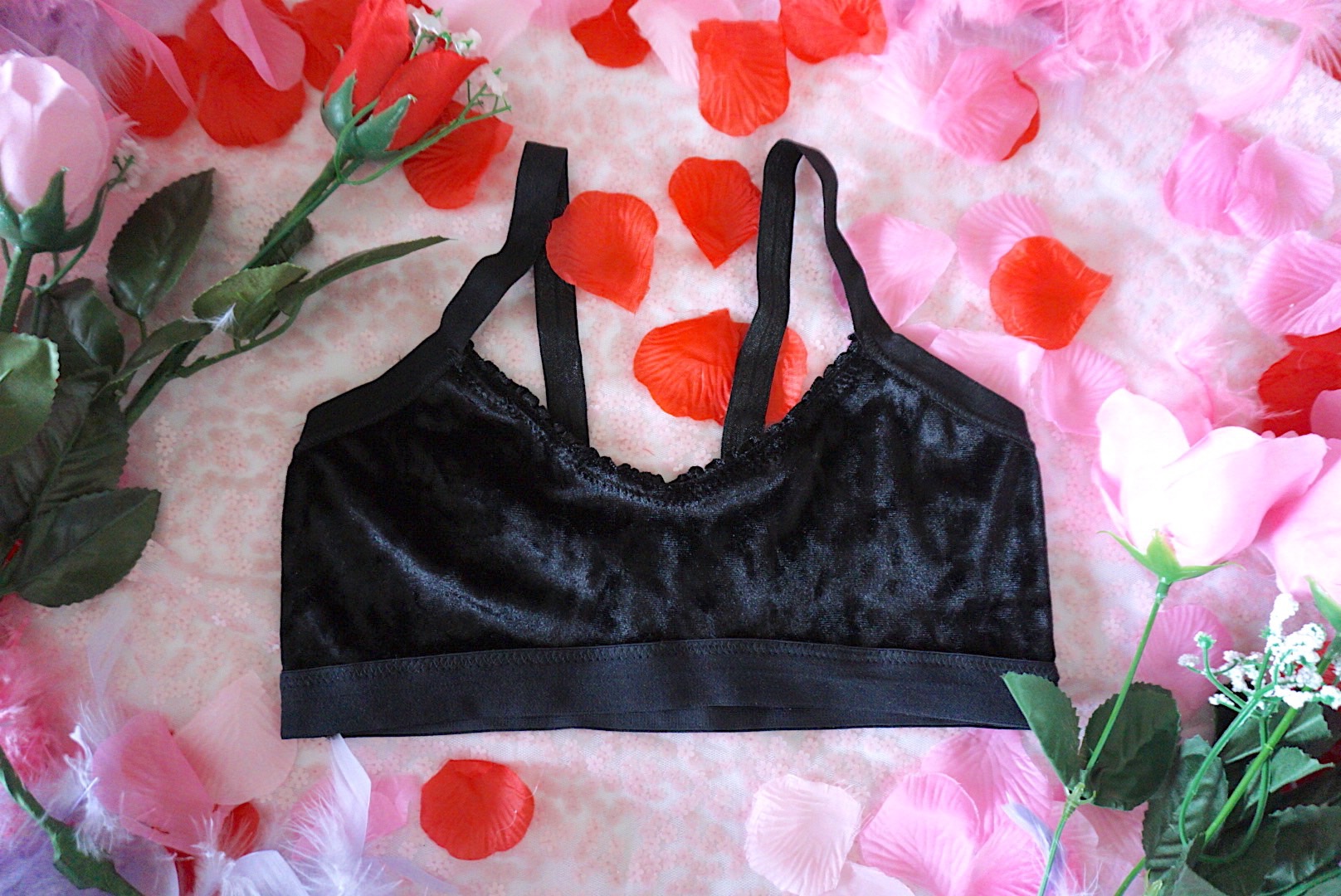 Super cute handmade black crushed velvet bralette with black trim. Comfy enough for snoozing, lounging or everyday wear!